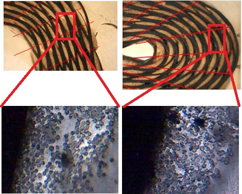 For two different values of the folding angle, the cross section shape of a carbon weft yarn has been observed globally (top of the view) and at the filament scale (down of the view). The increase of the folding angle value in the thickness of the 3D warp interlock fabric leads to the compaction of all the yarn’s filaments.